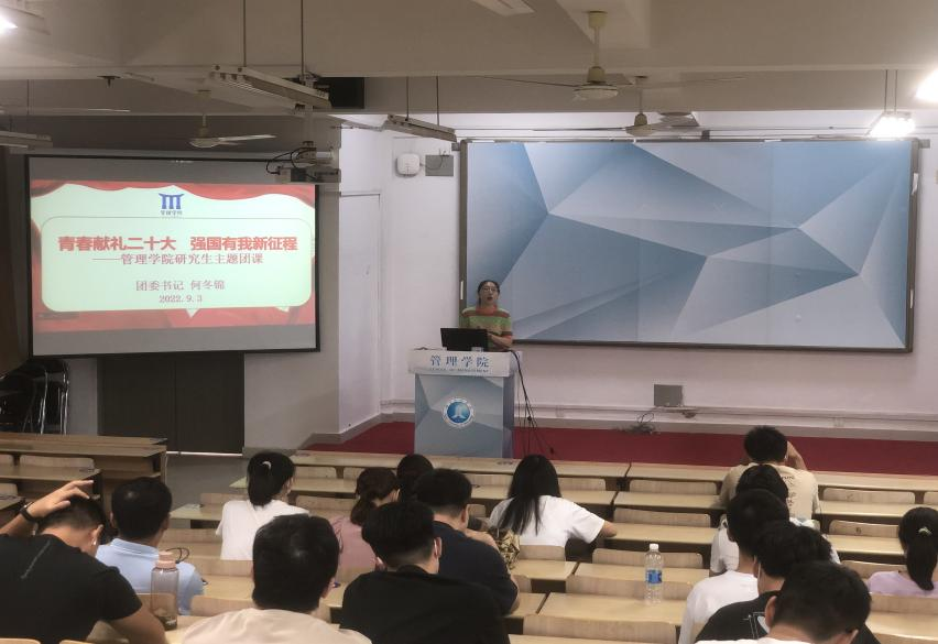 会后,辅导员何冬锦组织全体研究生开展以“青春献礼二十大,强国有我新征程”为主题的团课学习。课上,何老师领学了习近平总书记在庆祝中国共青团成立100周年大会上的重要讲话精神,普及了有关党的二十大召开的相关知识,她希望各位学生干部、党员、团员端正好政治站位,聚焦迎接和学习宣传贯彻党的二十大主题主线,主动担当作为,做足思想准备和行动准备,充分彰显党的助手和后备军应有的政治品格和精神风貌。