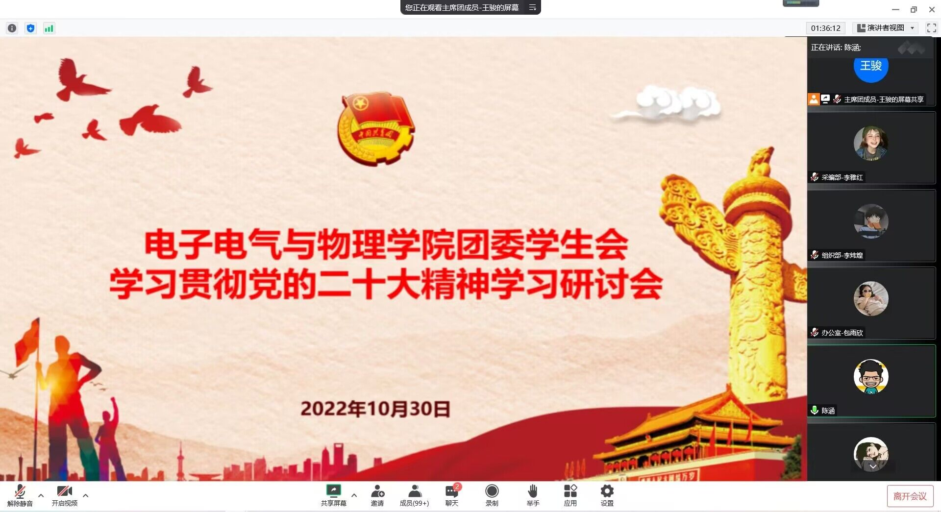 为深入学习贯彻党的二十大精神,10月30日晚,电子电气与物理学院团委学生会通过腾讯会议的形式线上召开学习贯彻党的二十大精神学习研讨会。此次研讨会由院学生会主席团候选人王骏主持,院团委书记陈涵、院团委学生会全体成员参加研讨会。