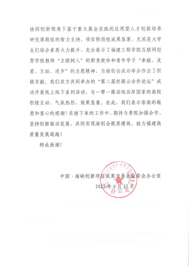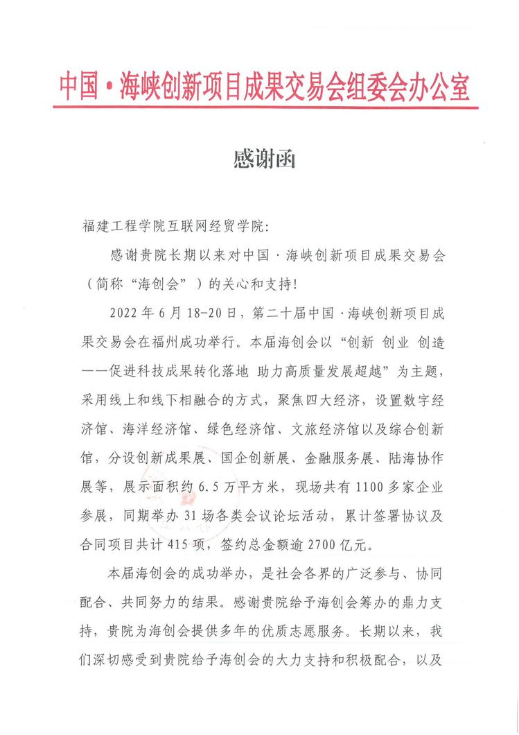 近日,中国˙海峡创新项目成果交易会办公室向我校以及学院分别发来感谢函,感谢学校、学院长期关心和支持“海创会”。在本届“海创会”上,学院积极承接志愿者相关组织工作,学校精心选拔了191名优秀研究生、大学生志愿者参与海创会志愿服务工作;学院还与福建省六一八产业发展有限公司共同举办“第二届丝路云合作论坛”等多场会议,共同实现“海创会”提质增效,助力福建高质量发展超越。