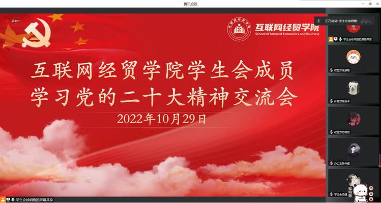 10月29日下午,互联网经贸学院学生会组织开展学习党的二十大精神交流会,本次学习交流会通过线上形式开展,会议由徐明煌同学主持,团委书记、学院学生会组织全体成员参与本次学习交流会。