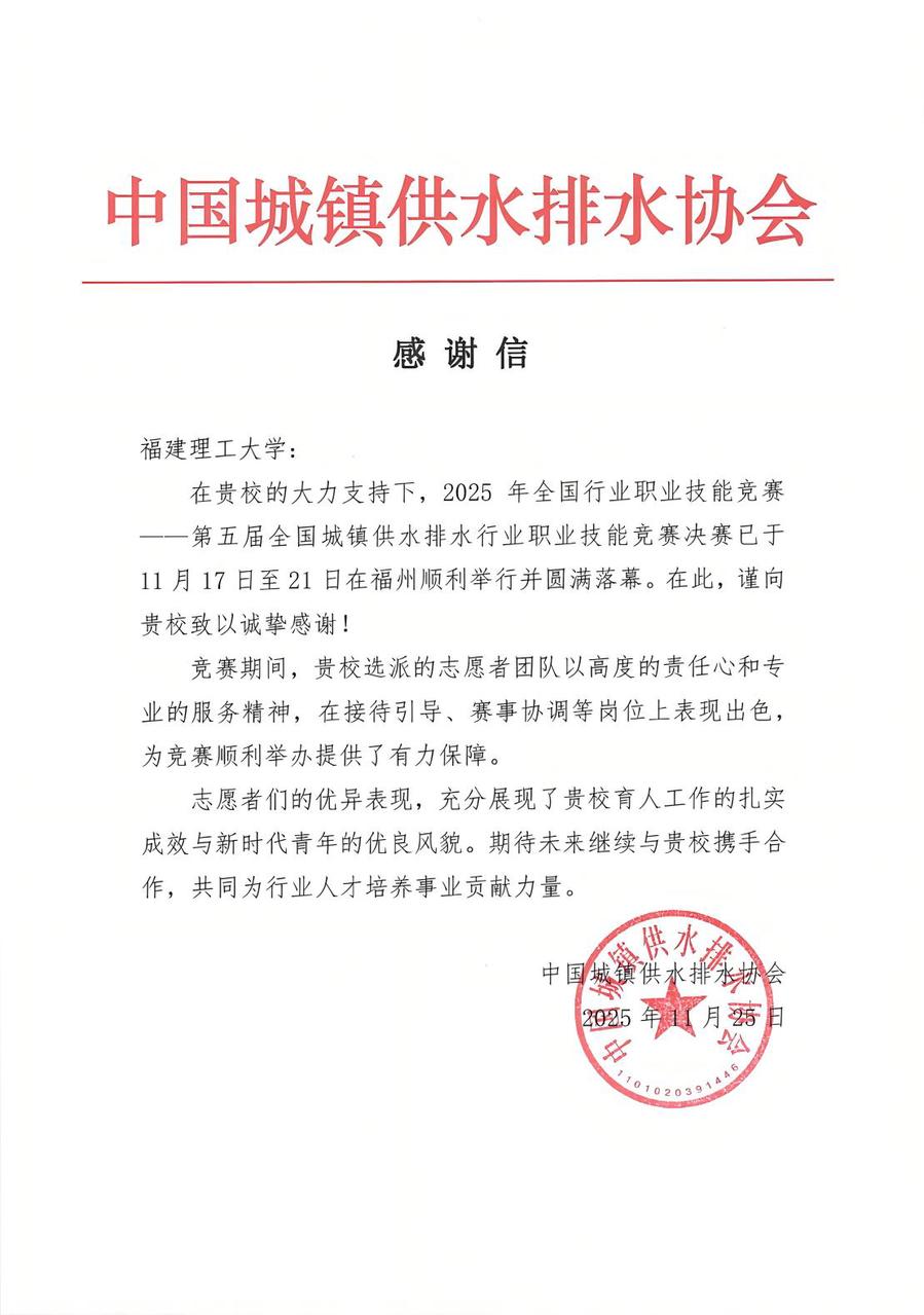 近日,中国城镇供水排水协会向我校发来感谢信,对我校志愿者助力第五届全国城镇供水排水行业职业技能竞赛工作,在接待引导、赛事协调等方面给予的大力支持与配合表示高度赞扬和感谢。