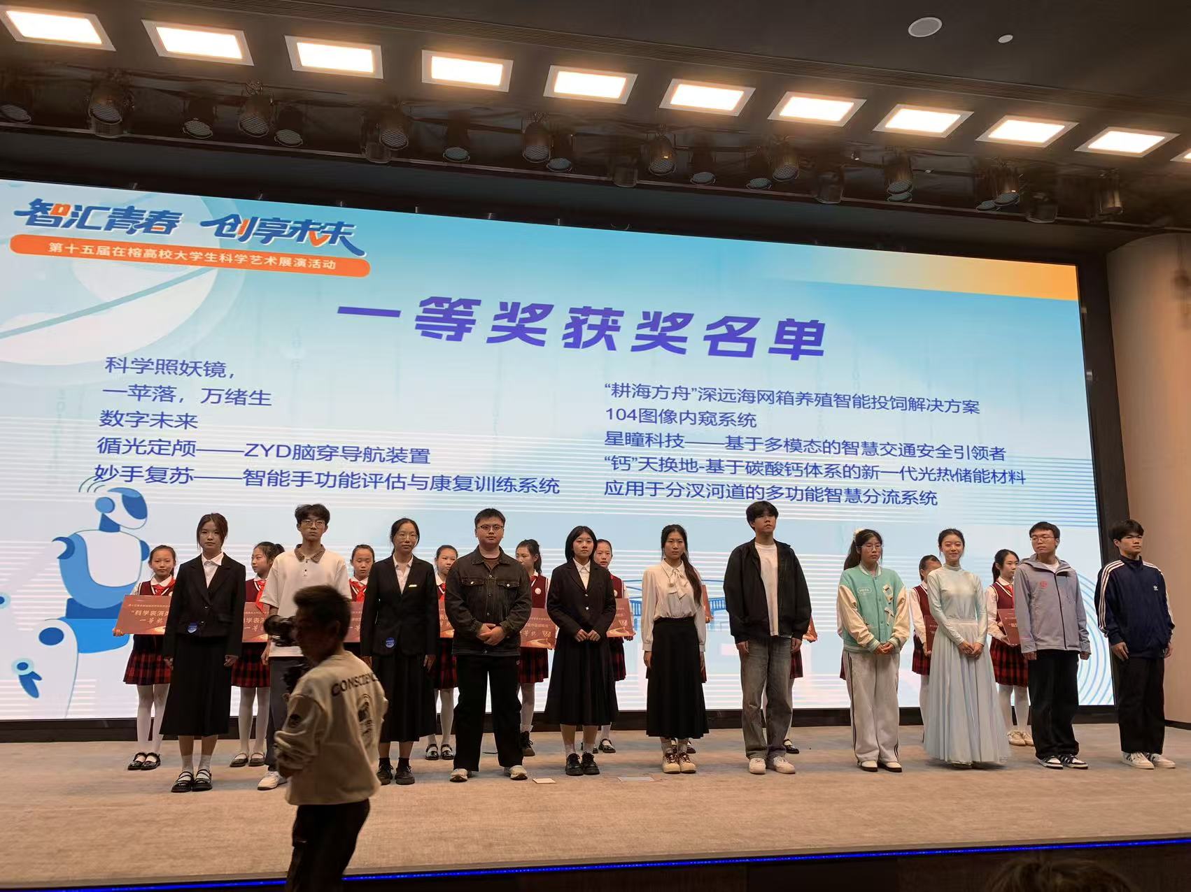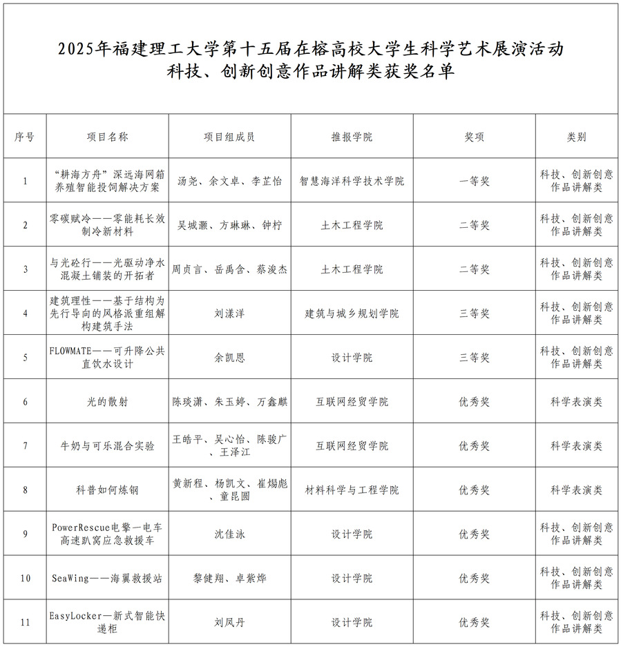 据悉,本次活动以“智汇青春,创享未来”为主题,旨在激发在榕高校大学生的创新精神和创造潜能,弘扬科学精神。活动分为“科技、创新创意作品讲解”与“科学表演”两大类别,吸引了在榕各高校学生团队积极参与。经过作品征集、初筛、线上初评及线下集中展示等多个环节的激烈角逐,我校选送的作品凭借其鲜明的创新性、扎实的科学内涵和出色的现场表现,在众多参赛项目中脱颖而出。