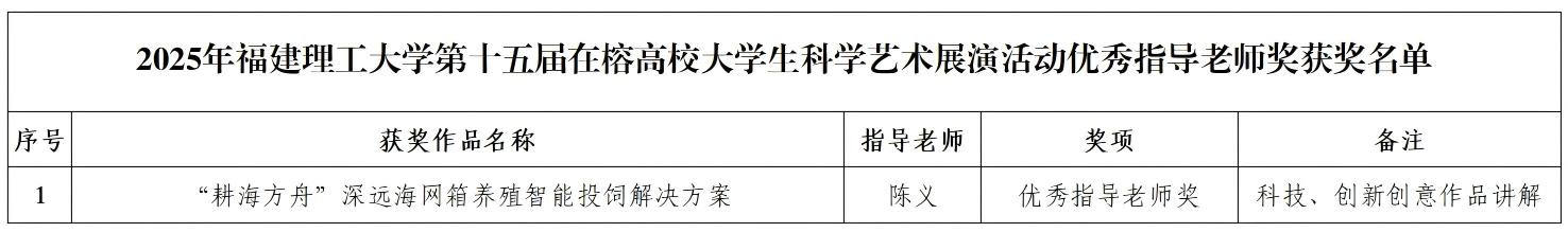日前,由福州市科学技术协会、共青团福州市委员会、福州市教育局联合主办的“第十五届在榕高校大学生科学艺术展演活动”圆满落幕。我校选送的作品获评一等奖1项、二等奖2项、三等奖2项、优秀奖6项,智慧海洋学院教师陈义获评“优秀指导老师”,获奖数量创我校参加该赛事活动新高,学校获评“优秀组织单位”。