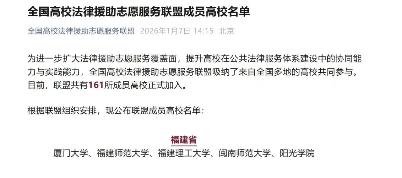 全国高校法律援助志愿服务联盟由中国政法大学、北京大学、武汉大学等8所高校共同牵头发起,汇聚了全国161所高校的优质资源与智慧力量。该联盟的成立,旨在深化法学教育与公共法律服务实践融合,进一步推动法律援助志愿服务专业化、体系化发展,为全面依法治国注入高校力量。